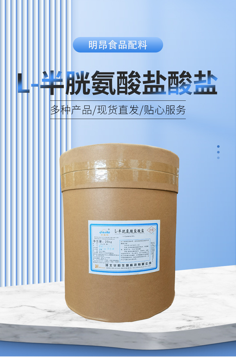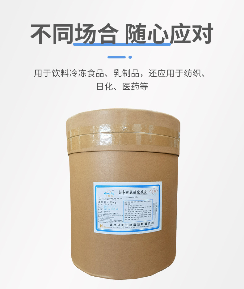 L半胱氨酸是一种具有生理功能、在自然界广泛存在的重要物质。它在动植物体内是各组织细胞用来防御有害物质的一种氨基酸,也是组成蛋白质的20多种氨基酸之一,并且是具有活性巯基(-SH)的氨基酸。可用作 面包发酵促进剂、保鲜剂;加速谷蛋白的形成,防止老化;用于天然果汁可防止Vc的氧化和褐变;预防放射线损伤作用。